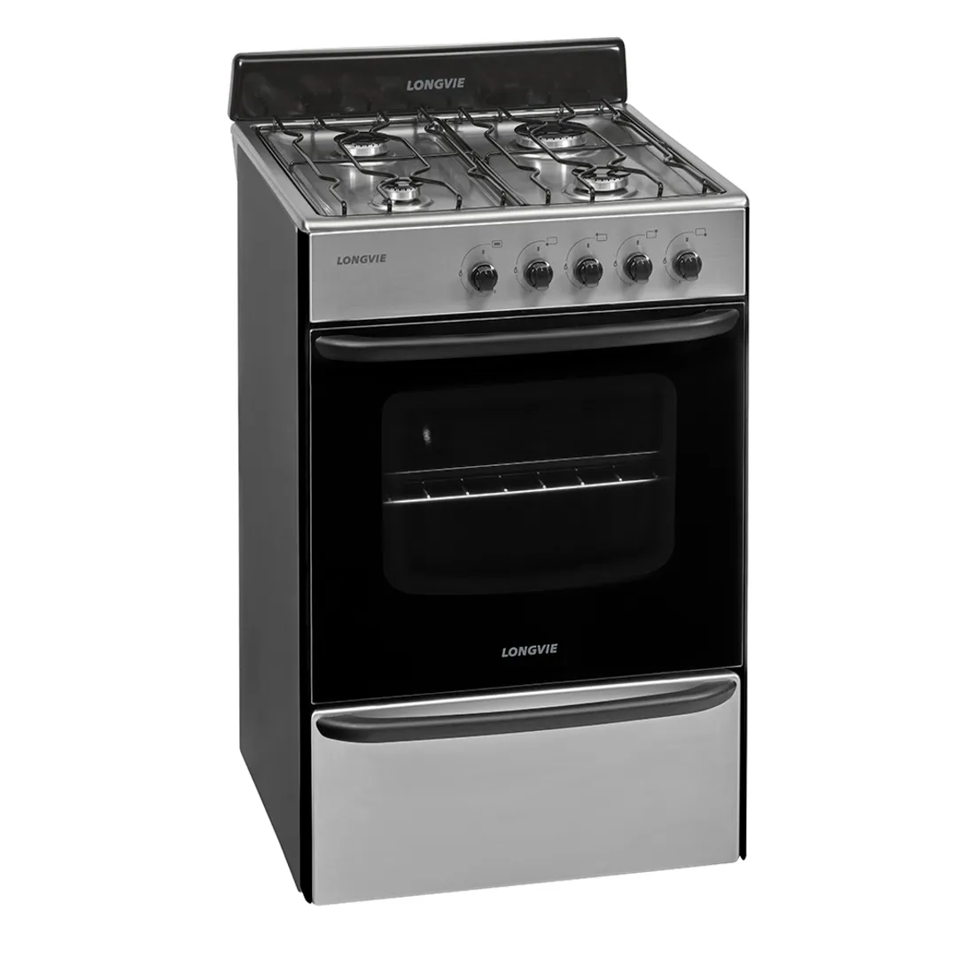 Cocina a gas Longvie con terminación en acero inoxidable y diseño moderno. Ofrece excelente rendimiento y bajo consumo gracias a su alta eficiencia energética, además de horno con sistema QuickClean y grill a gas para lograr cocciones perfectas.